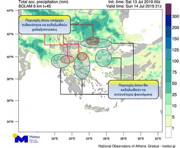 Κατά τη διάρκεια της Κυριακής οι καταιγίδες θα επιμείνουν στα βορειοανατολικά τμήματα της χώρας και βαθμιαία θα επηρεάσουν νησιωτικά τμήματα του Ανατολικού Αιγαίου. Παράλληλα, βροχές και καταιγίδες θα εκδηλωθούν στα κεντρικά και ανατολικά ηπειρωτικά τμήματα.
