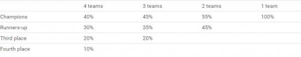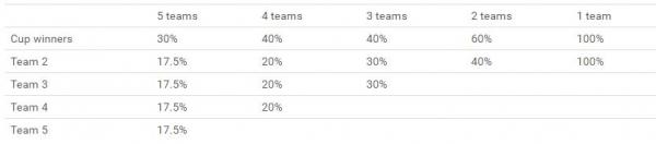 Για παράδειγμα στην πρώτη τη τάξει διασυλλογική διοργάνωση θα δοθούν για το Market Pool 292 εκατ. ευρώ που αντιστοιχεί στο 15% των χρημάτων που θα διατεθούν. Παρακάτω λοιπόν θα δείτε τον διαχωρισμό ανά ποσοστό των χρημάτων.