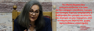 «Τα εθνικά θέματα δεν αντιμετωπίζονται a la carte. Αν δεν υπάρχει υπεύθυνη, έγκυρη και έγκαιρη, κυρίως, ενημέρωση, η Κυβέρνηση δεν μπορεί να απαιτεί, και σίγουρα να μην περιμένει, από το κόμμα μας άκριτη και χωρίς προϋποθέσεις υποστήριξη».